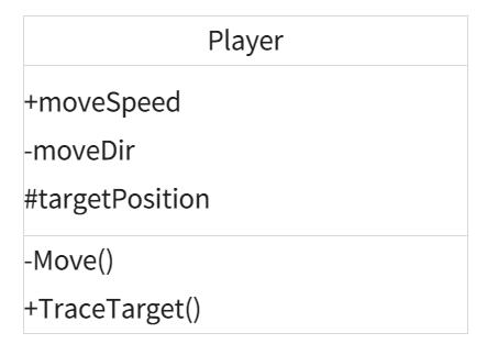 Player는 클래스 이름 moveSpeed, moveDir, targetPosition은 속성, Move()와 TraceTarget()은 연산이다. 속성과 연산을 접근제어자로 보면 moveSpeed와 TraceTarget()은 public, moveDir과 Move()는 private, targetPosition은 protected이다. |