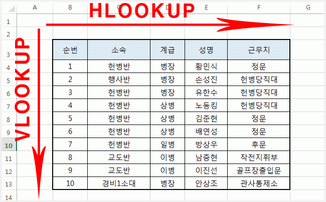 VLOOKUP 함수와 HLOOKUP 함수의 사용법은 거의 동일하지만 약간의 차이가 있다. 그 차이는 바로 지정 값의 검색 방향이다. VLOOKUP의 경우 열을 검색하고, HLOOKUP은 행을 검색한다.