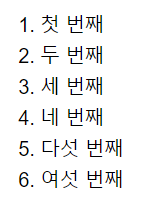 | 1. 첫 번째 2. 두 번째 3. 세 번째 1. 네 번째 1. 다섯 번째 1. 여섯 번째 |
