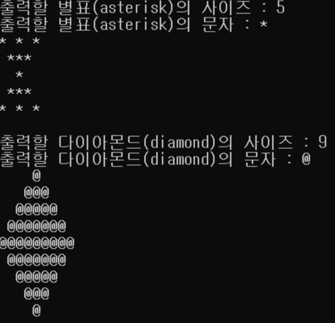 도형을 별표(=asterisk)와 다이아몬드로 그리는 프로그램을 작성하시오. 프로그램은 도형의 크기(N)를 입력으로 사용한다. N은 5에서 29사이의 홀수이며, 올바른 입력을 한다면 별표와 다이아몬드를 그릴 문자를 각각 입력해 출력하시오.