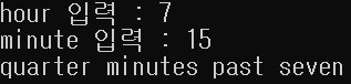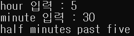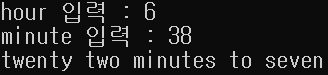 시간이 숫자로 주어지면 텍스트로 변환하는 프로그램을 작성하시오. 분이 0이면 o'clock을 사용한다. 1분부터 30분까지는 past를 사용하고 31분부터 59분까지는 to를 사용한다.