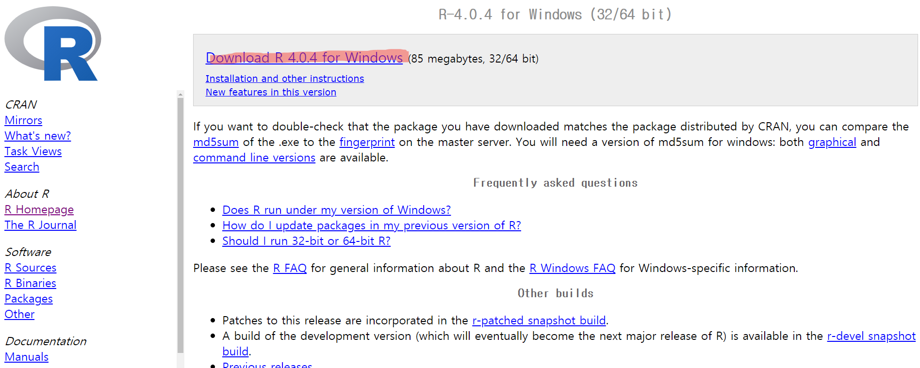 5. Download R 버전 for Windows를 클릭하여 설치 파일을 다운로드 한다.