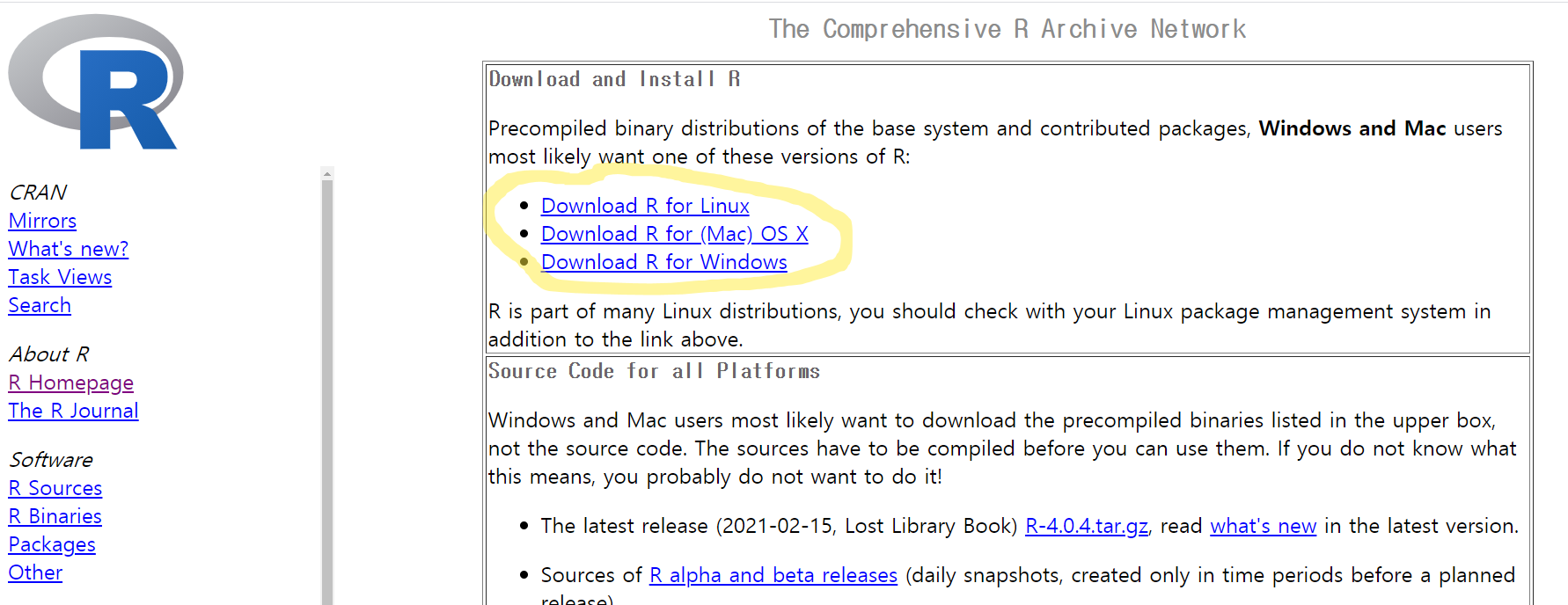 3. 선택한 링크를 타고 들어가면 다음과 같이 나오는데 여기서 자신의 운영체제에 맞는 것으로 클릭하면 된다. 윈도우의 경우 Download R for Windows를 누르면 된다.
