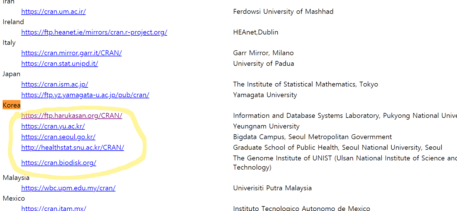 2. 국가별로 다운 받을 수 있는 곳의 링크가 나오는데 여기서 대한민국의 링크 사이트 들을 찾아보면 다음과 같이 나온다. 노란색 쳐져 있는 부분 중에서 아무거나 하나 접속하면 된다.