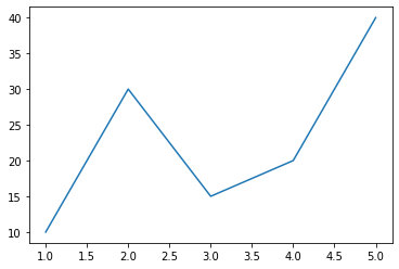 이번에는 plot()함수에 두 개의 리스트가 콤마(,)로 구분되어 입력된 것이다. 두 개의 리스트 중 첫번째 리스트인 [1,2,3,4,5]가 x축 값이고, 두번째 리스트인 [10,30,15,20,40]가 y축 값으로 입력된다.