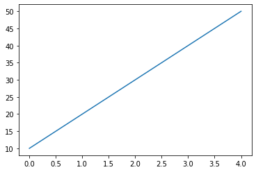 아래 코드는 [10,20,30,40,50]이라는 값만을 가지고 plot을 그린 것이다. 이 값들이 x축을 가리킬지, y축을 가리킬지 모르겠다면 출력 결과를 통해 알 수 있다. [10,20,30,40,50]은 바로 y축 값들이다. x축의 값들을 생략할 경우 x축은 range(y축 데이터 개수)로 표현된다.