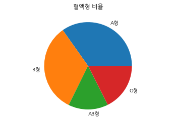 pie() 함수는 전체 데이터 중 특정 데이터의 비율을 보기 쉽게 표현한다. 혹시 원이 찌그러져서 나온다면 axis() 함수를 추가하면 원을 동그랗게 그릴 수 있다.