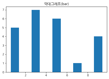 bar() 함수는 수직 막대그래프를 표현하는 명령어이다. 막대그래프에서 막대의 길이는 각 데이터의 크기를 의미한다. 아래는 막대그래프의 예시 코드와 그 결과이다.