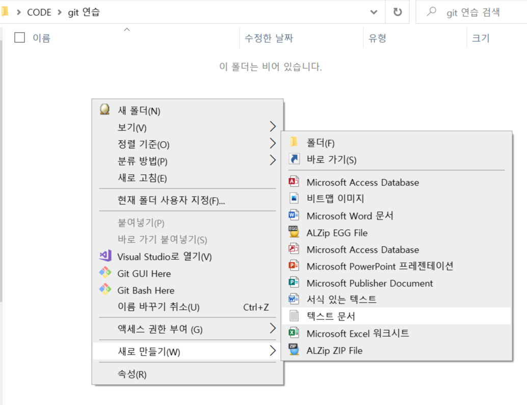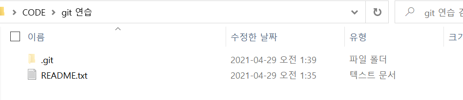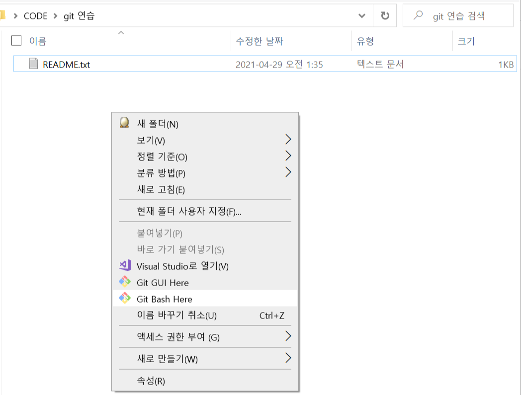 (아래의 폴더 위치 : 내 컴퓨터>바탕화면>CODE>git 연습)