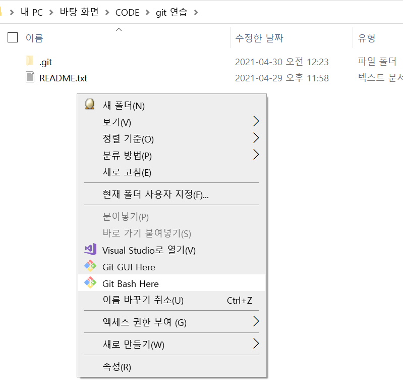 1. 갱신할 로컬저장소에서 오른쪽 마우스 버튼을 클릭해 Git Bash Here를 선택