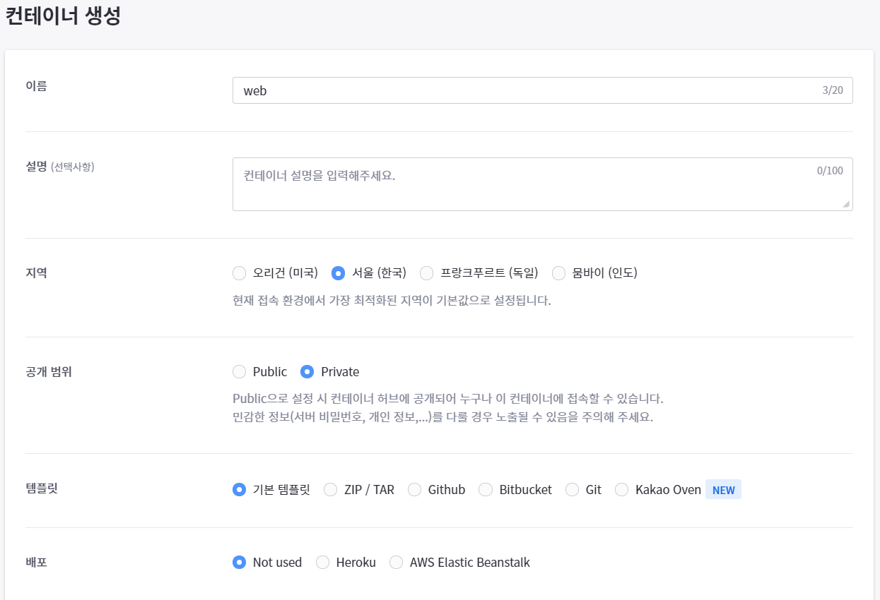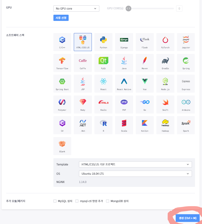 3. 아래와 같이 기본 설정(필요한 부분은 각자 설정에 맞게 변경)을 한 뒤 생성 버튼 클릭