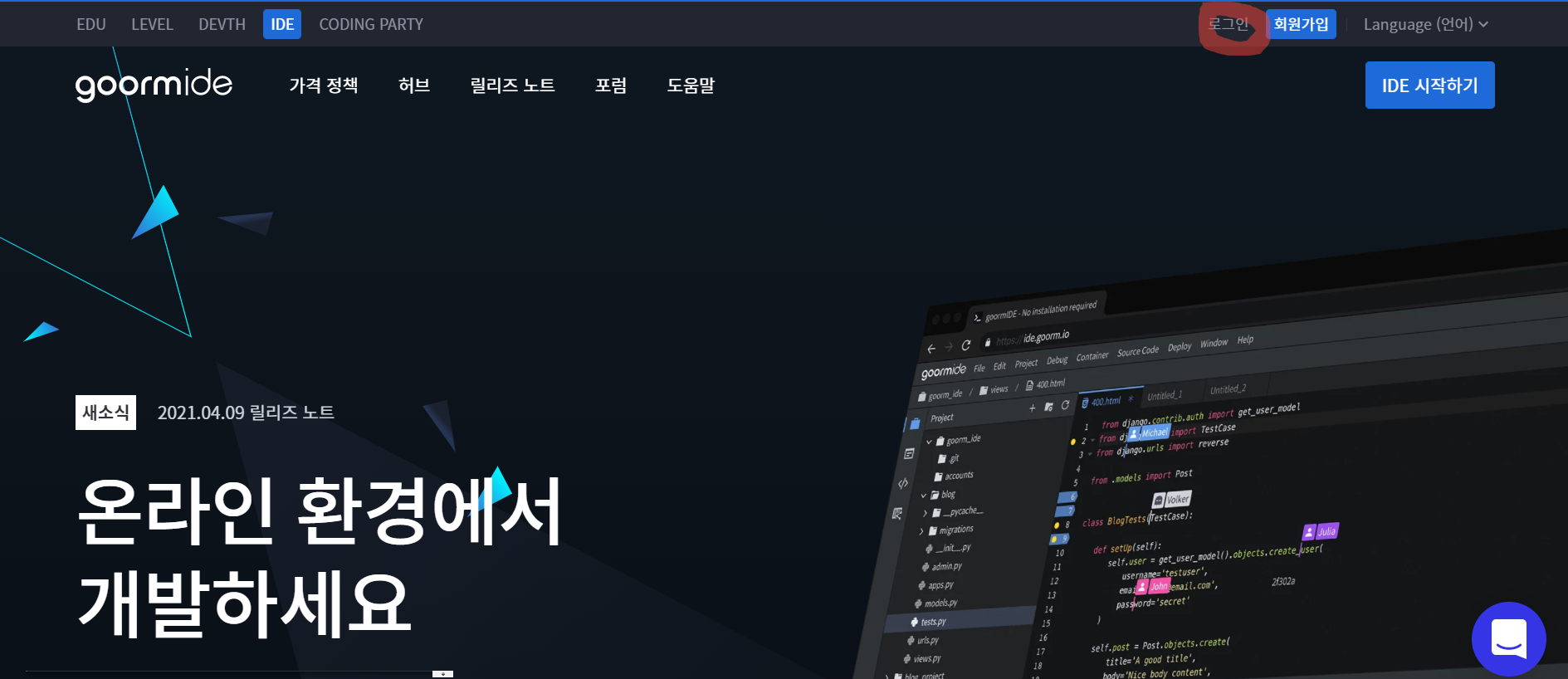 1. 구름 ide에 접속 후 로그인 진행(회원이 아니라면 회원가입을 해야함)