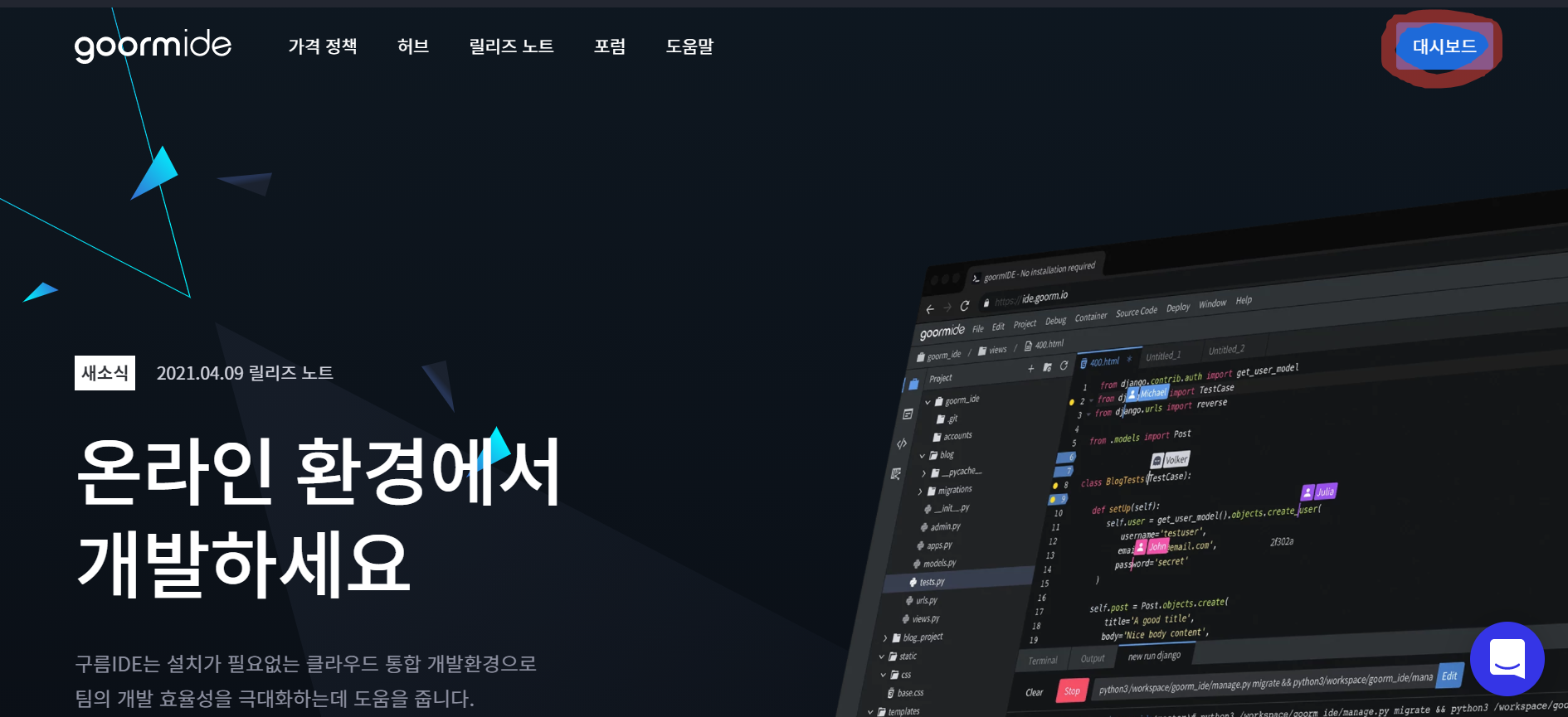 (혹시 위의 화면이 바로 나오지 않는다면 구름 ide에서 대시보드를 클릭)