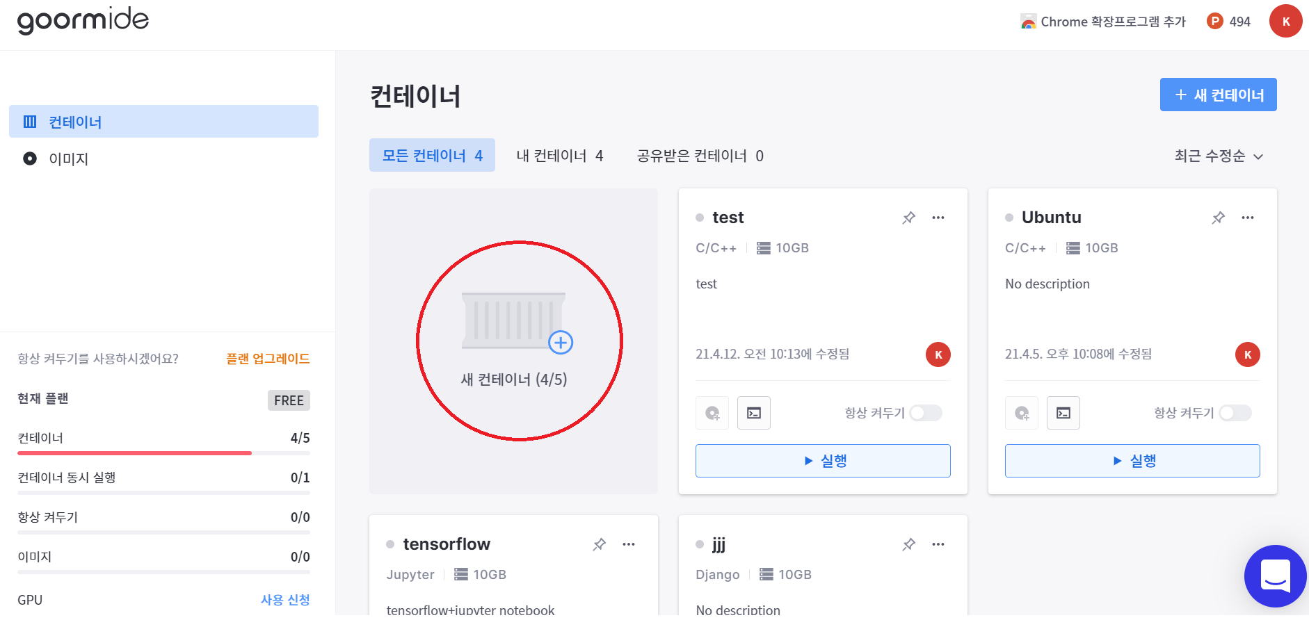 2. 로그인을 하면 다음과 같은 화면이 나타나는데 여기서 새 컨테이너 생성을 클릭