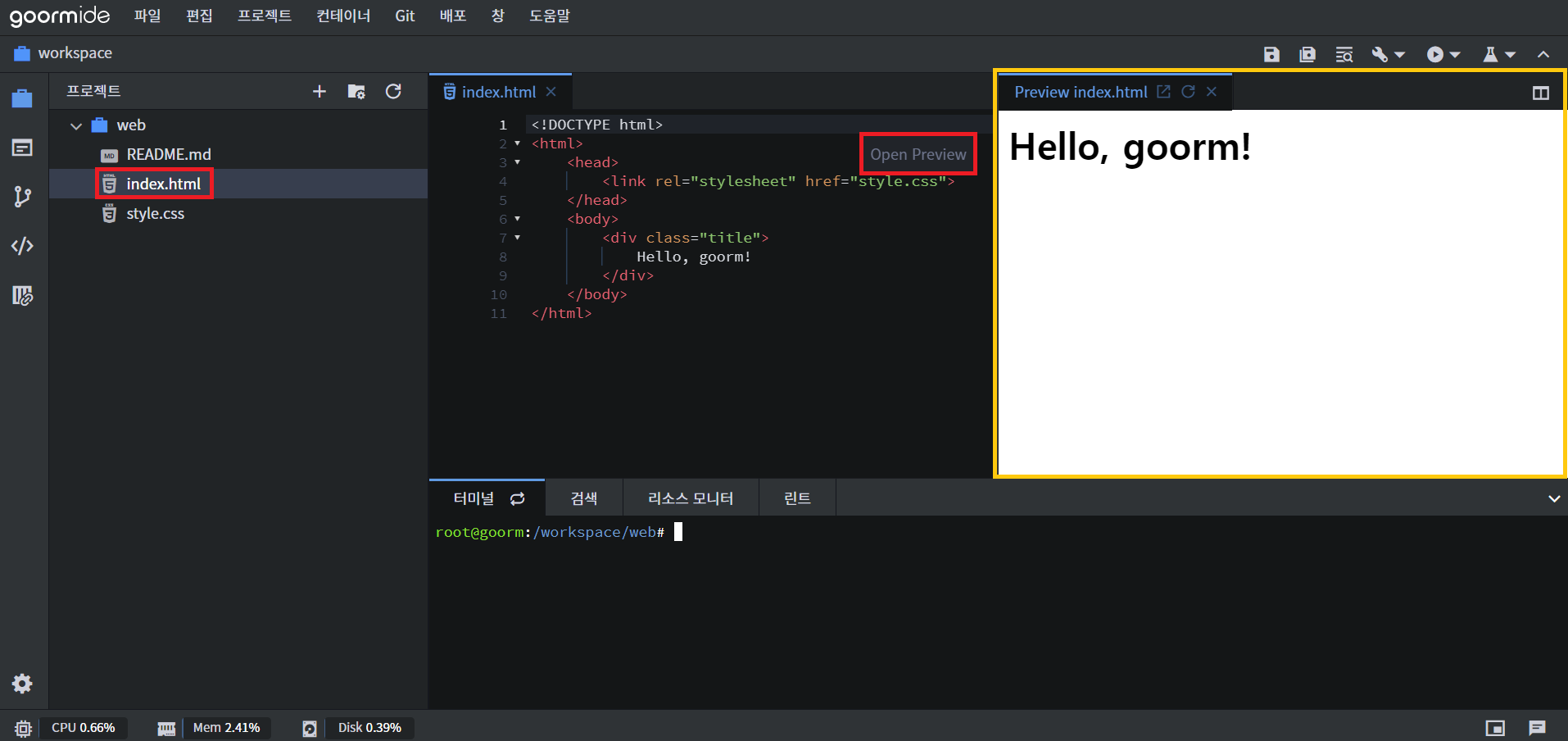goorm(구름) ide로 html/css/js 실습 환경 만들기 본문