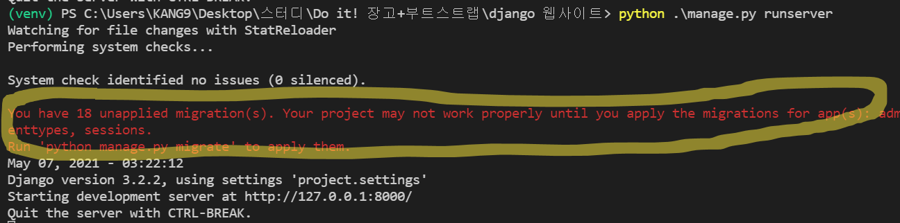이 오류는 '아직 18개의 적용되지 않은 마이그레이션이 있으며 이 마이그레이션을 적용하기 전까지 프로젝트가 제대로 작동하지 않을 수 있다'는 의미이다. 이때, 적용되지 않은 마이그레이션의 개수는 장고 버전에 따라 다를 수 있다.
