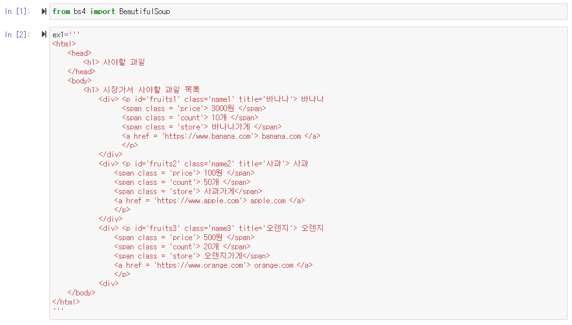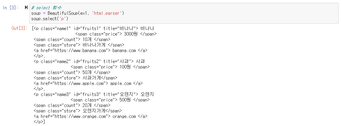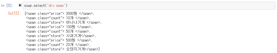 아래는 아이디명이 fruits1이고 <span> 태그의 클래스명이 store인 것을 추출한 것이다.