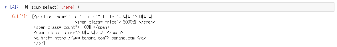 아래는 <p> 태그의 클래스 이름이 name1이고 <span> 태그의 클래스 이름이 store인 것을 추출한 것이다.