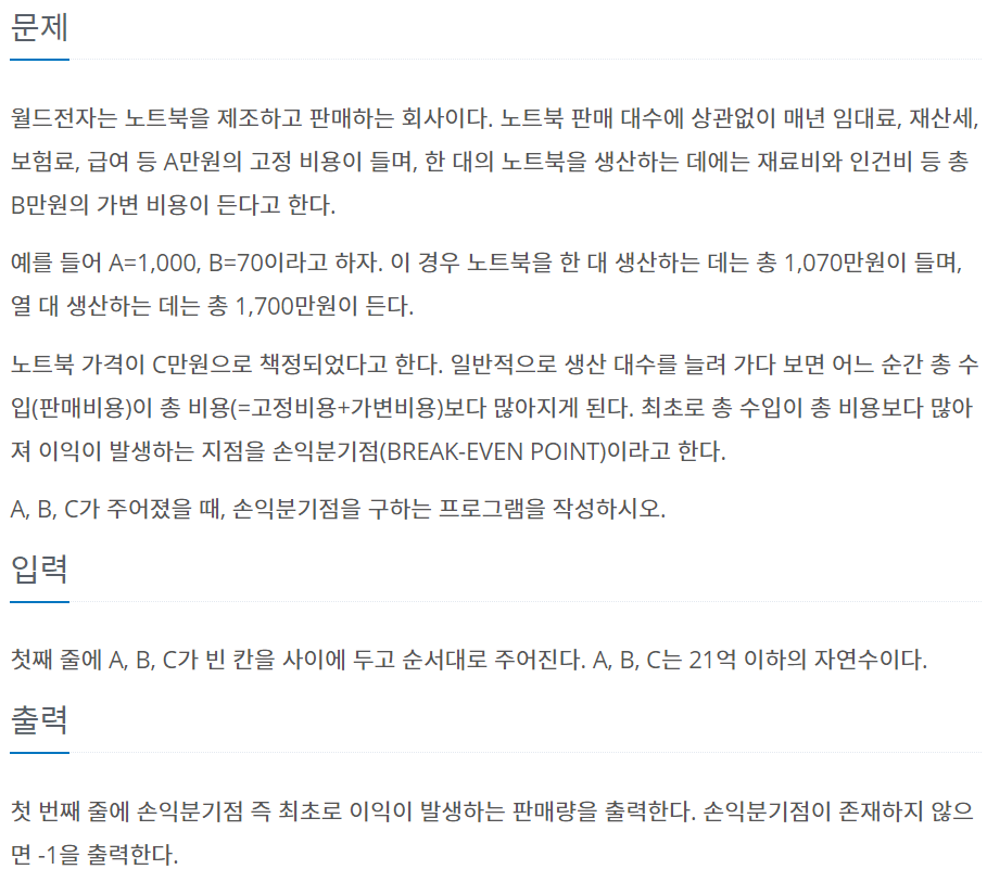 이 문제에서 출력 결과는 손익분기점이 있을 경우와 없을 경우로 나누어진다. 손익분기점이 없을 경우는 B라는 가변비용보다 C라는 상품 가격이 클 때이다. 간단하게 생각해보면 생산하는데 드는 비용이 판매하는 가격보다 크면 그것은 손실이기 때문에 손익분기점이 없다.