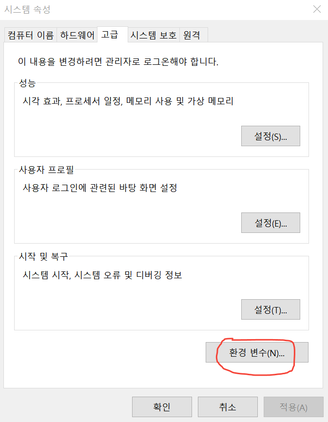윈도우의 경우 [제어판 > 시스템 및 보안 > 시스템 > 고급 시스템 설정]으로 들어가면 아래와 같이 나오는데 여기서 환경변수를 눌러 주면 관련해서 환경변수를 필요에 따라 추가, 수정, 제거를 수행할 수 있다.