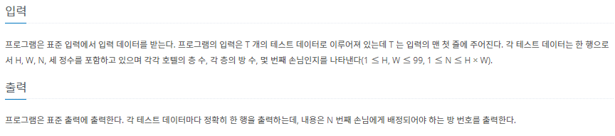 [파이썬, Python] 백준 10250번 : ACM 호텔 본문