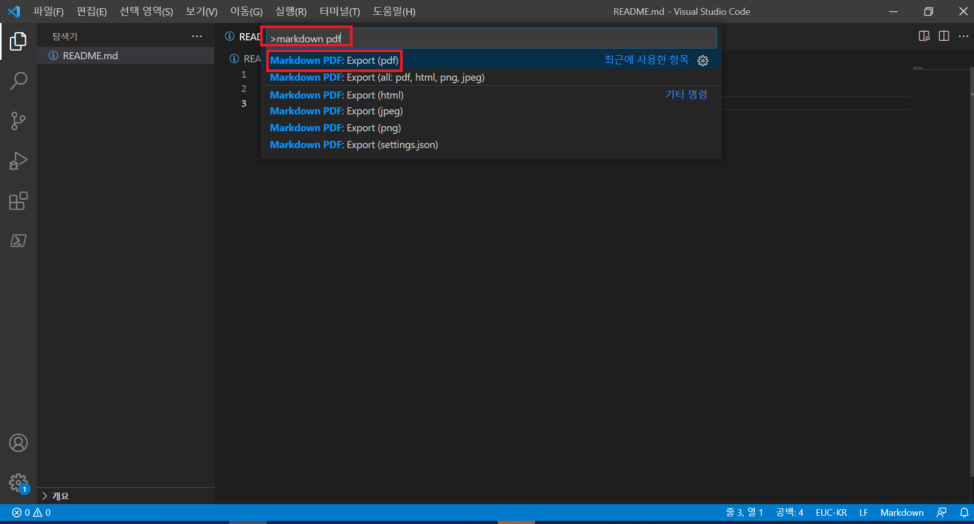 우선 vscode에서 Markdown PDF를 다운받아준다.