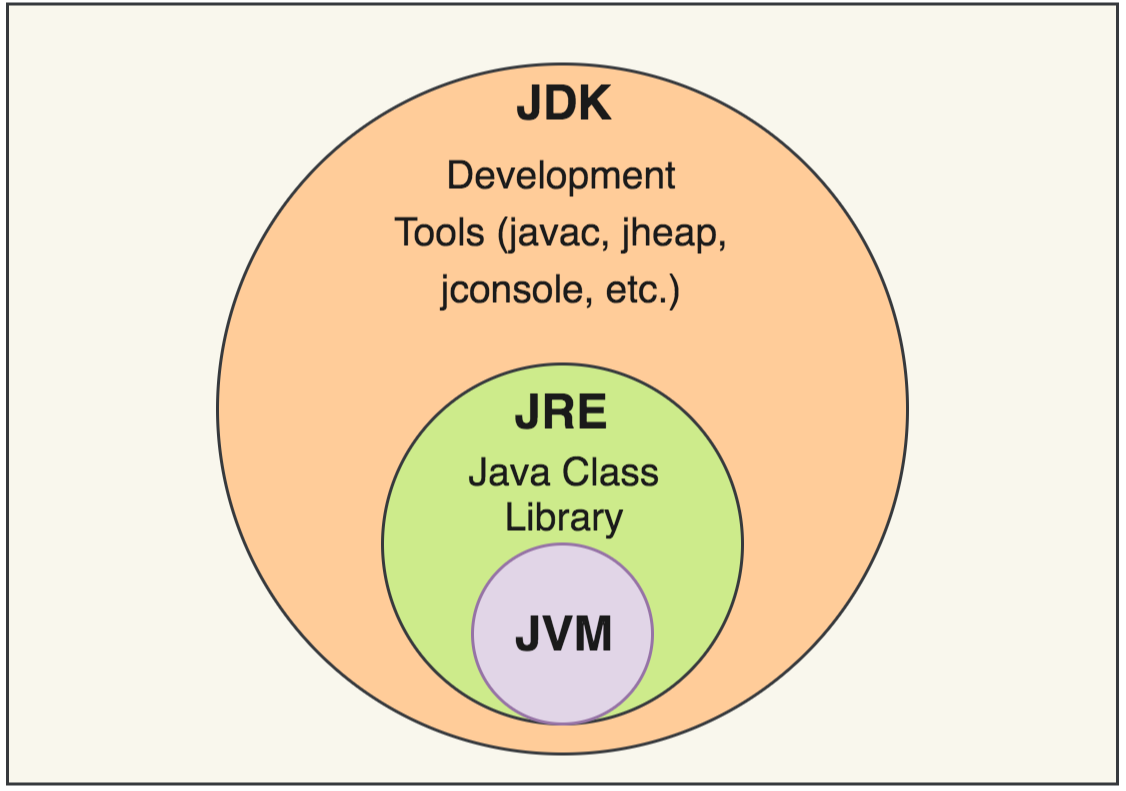 JVM(Java Virtual Machine), JRE(Java Runtime Environment), JDK(Java Development Kit)