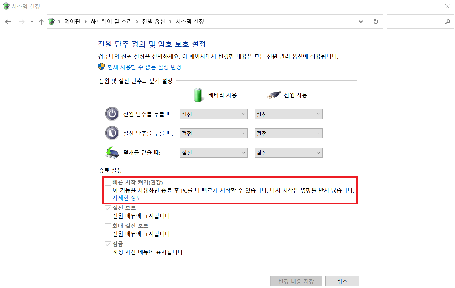 윈도우 10 부팅시 인터넷 연결 실패 등의 문제점 - 빠른 시작 켜기 본문