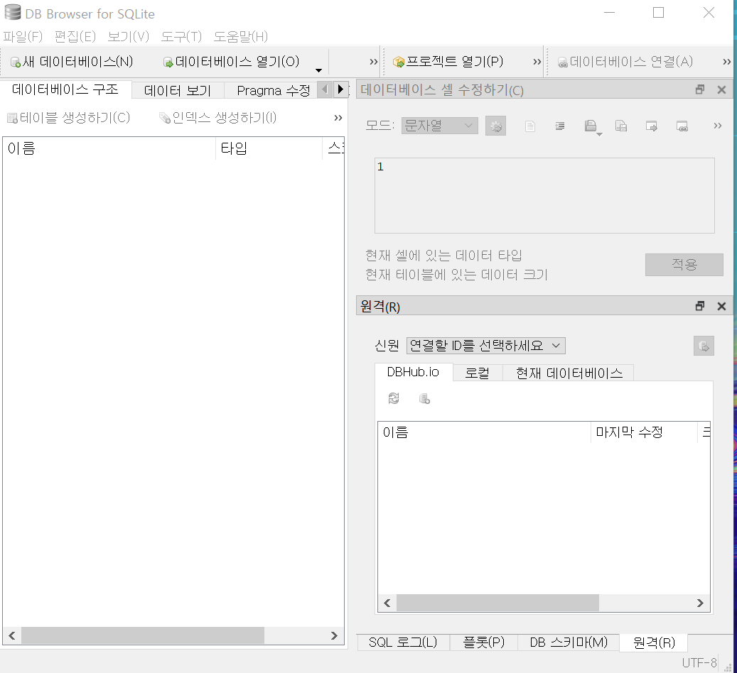 설치하고 DB Browser for SQLite를 실행시키면 다음과 같은 GUI를 볼 수 있다. 여기서 데이터베이스 열기를 통해 db를 확인할 수 있다.