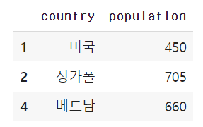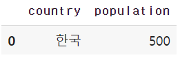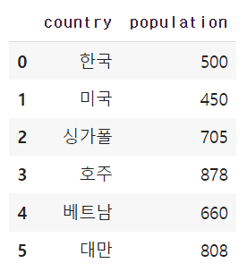 df = pd.DataFrame([{"country":"한국","population":500},{"country":"미국","population":450},{"country":"싱가폴","population":705},