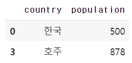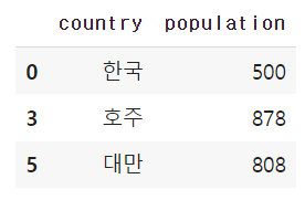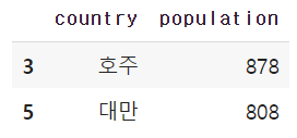 이번 코드는 country가 한국이 아닌 것 중 population이 800이상인 것을 추출하는 것이다.