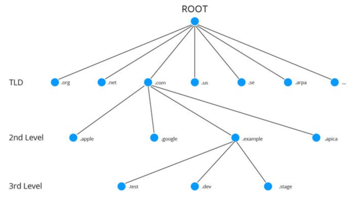 도메인은 “.”또는 루트(root)라 불리는 도메인 이하에 아래 그림과 같이 역트리(Inverted tree)구조로 구성되어 있다. 아래와 같이 3단계로 구분된다.