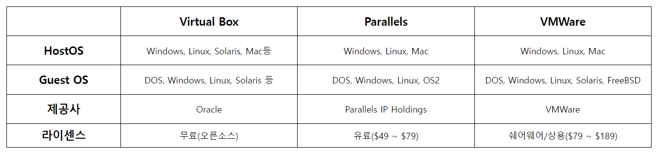 1. Virtual Box - innotek 에서 제작된 소프트웨어로 현재 오라클에서 상용 및 사유 - 지원 : 리눅스, OS X, 솔라리스, 윈도우 - 32비트 가상화 소프트웨어 - open source - VMWare 워크 스테이션 및 마이크로소프