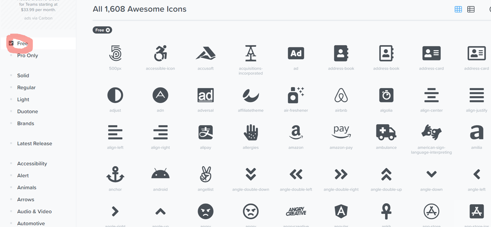 이제 Font Awesome 홈페이지의 Icons 메뉴에서 원하는 아이콘을 찾으면 된다. 이때, 무료 아이콘만 사용하고 싶다면 Free 옵션을 선택해주고 검색하는 것이 좋다.