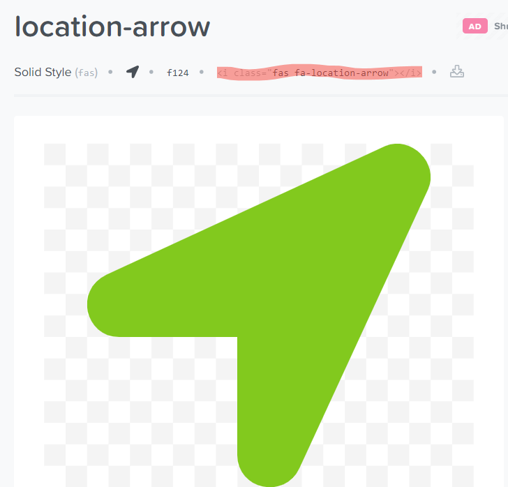아래와 같은 아이콘을 사용하고자 한다면 빨간색으로 표시한 부분을 복사해서 원하는 위치에 넣으면 된다. 물론 이것의 class="fas fa-location-arrow" 부분만 사용해서 button 태그로 사용할 수도 있다. 그외에 색상 및 크기등은 style로 변경해주면 된다.