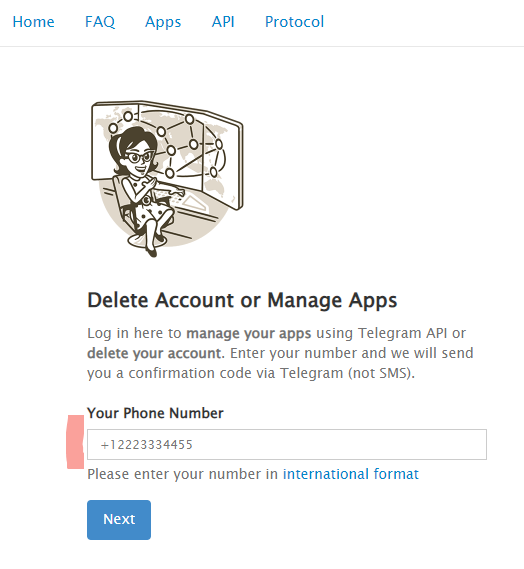 Delete Account or Manage Apps Log in here to manage your apps using Telegram API or delete your account. Enter your number and we will send you a confirmation code via Telegram (not SMS).