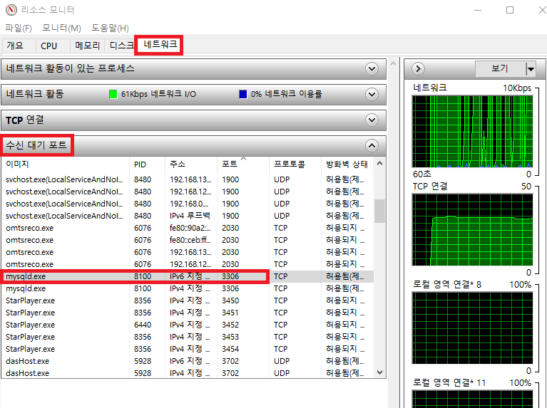 윈도우를 기준으로 했을때, 윈도우키+R을 누른 뒤, resmon.exe를 입력해 리소스 모니터를 열어준다. 네트워크탭의 수신 대기 포트에서 포트가 3306인 것을 찾는다. 이에 해당하는 PID 번호를 기억해둔다.