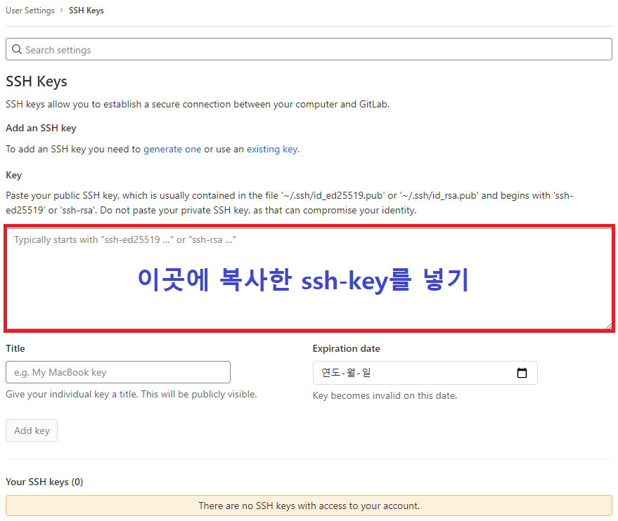 깃랩에 ssh-key 등록을 하기전 자신의 컴퓨터에 ssh-key를 발급해야 하는 과정은 아래 게시물을 참고하는 걸 추천한다.
