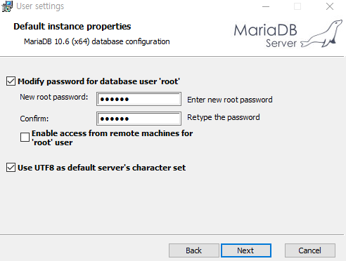 아래 화면이 나오면 root 계정에 대한 비밀번호를 설정해주고 UTF8 관련 체크 박스에 체크를 해 데이터베이스의 기본 character set을 UTF8로 지정한다.
