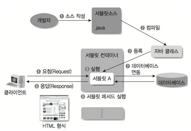 - 웹페이지 등을 동적으로 생성하거나 데이터 처리를 수행하기 위해 자바로 작성된 프로그램