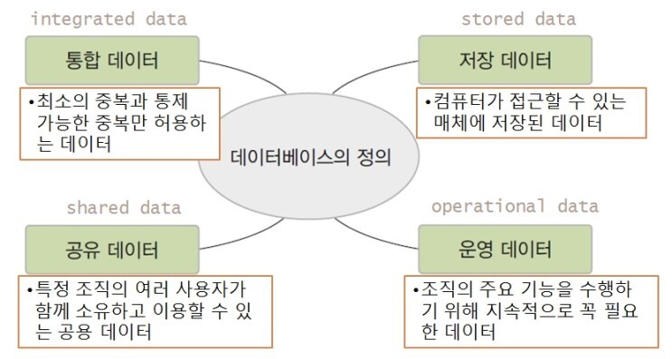 데이터베이스는 특정 조직의 여러 사용자가 공유하여 사용할 수 있도록 통합해서 저장한 운영 데이터의 집합이라고 정의한다.