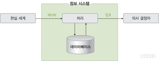 조직 운영에 필요한 데이터를 수집하여 저장해두었다가 의사 결정이 필요할 때 처리하여 유용한 정보를 만들어주는 수단을 정보 시스템이라고 한다. 아래 그림을 보면 알겠지만 정보시스템 안에서 데이터를 저장하고 있다가 데이터 처리가 필요할 때 데이터를 제공하는 핵심 역할을 데이터베이스가 한다.