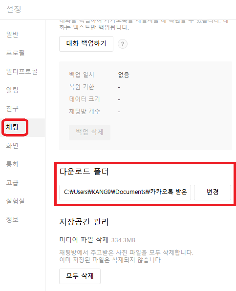 카카오톡 다운로드 폴더 변경, 위치, 경로 변경 하는 방법