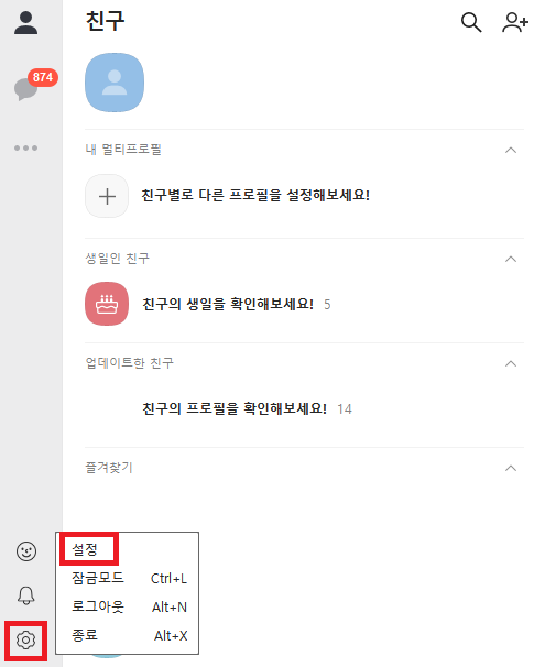 우선 카톡을 키고 톱니 바퀴를 누른다음 설정을 클릭한다.