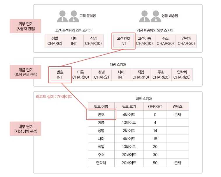 3단계 구조를 통해, 모든 데이터의 저장·유지와 관련된 복잡한 내용을 숨기고 필요한 데이터만 단순화한 외부 단계의 관점을 일반 사용자들에 제공 가능하다.