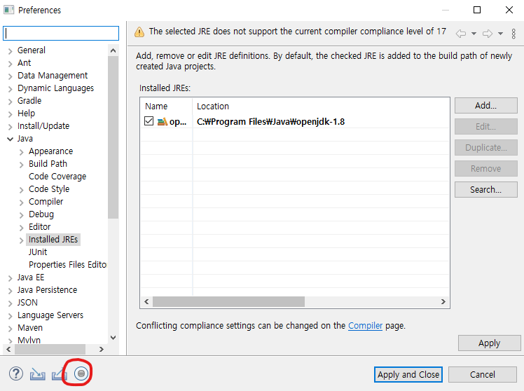 위의 창이 나오지 않게 하기 위해서 이클립스 상단의 Window 탭에서 Preferences를 클릭한후 아래와 같이 나오면 하단의 동그라미 부분이 있을 텐데 이때, 빨간 동그라미를 클릭하여 아래 사진과 같은 색이 나오면 된다.