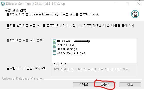 구성 요소 선택 창이 아래와 같이 나오면 그대로 두고 다음을 클릭한다.