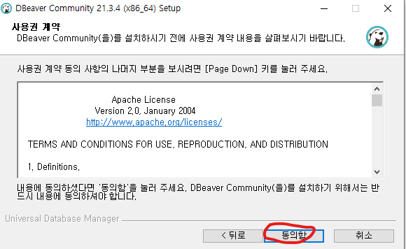 설치를 계속하려면 다음을 클릭하고 동의함을 클릭한다.