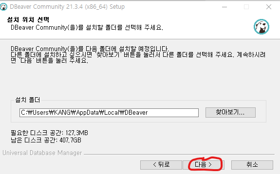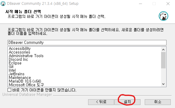 원하는 설치 위치가 있다면 변경을 해주고 그렇지 않다면 다음을 클릭한다. 그 다음 시작 메뉴 폴더 선택 창에서도 설치를 클릭하고 넘어가면 된다.