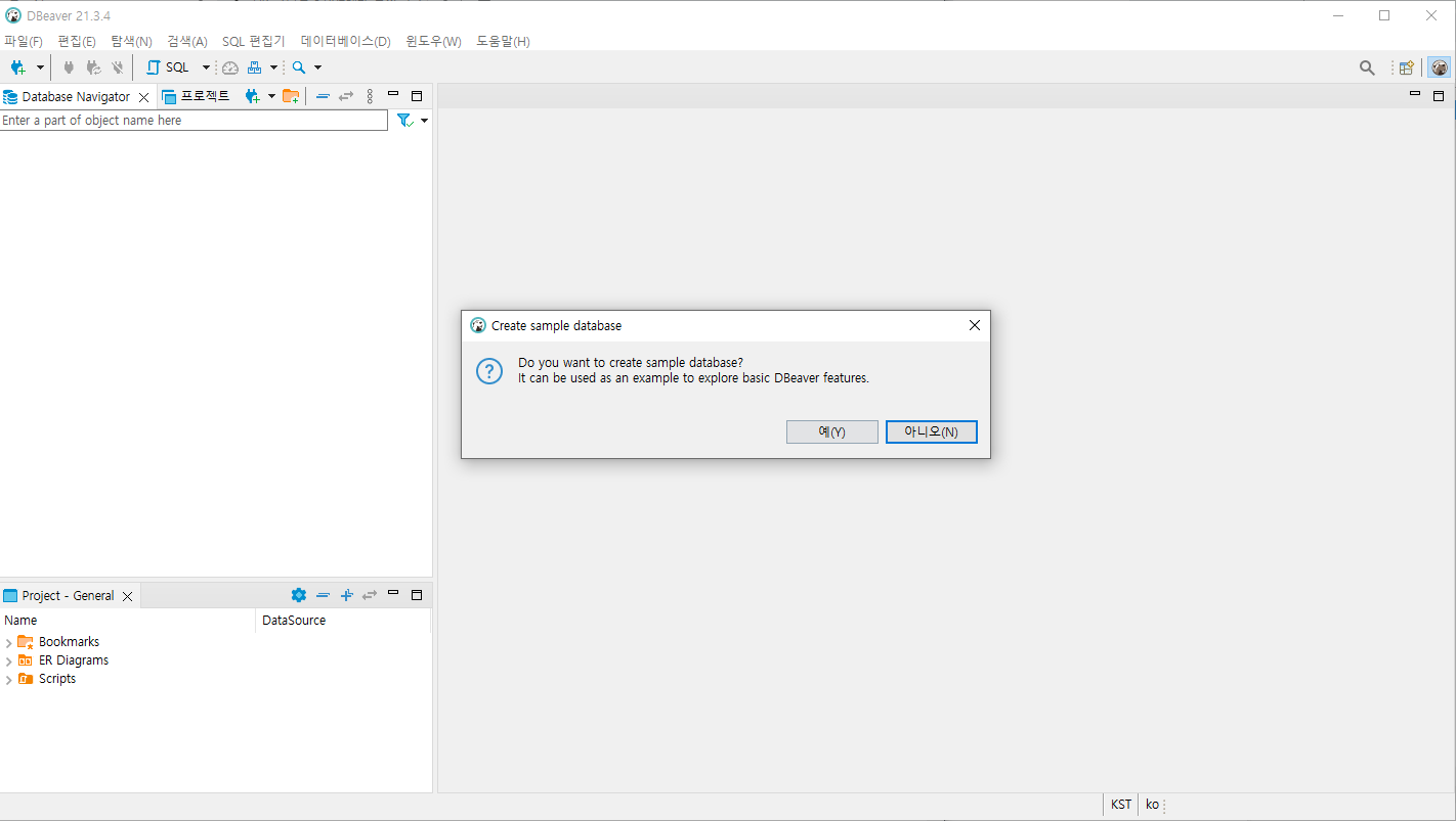 설치가 완료된 후 처음 디비버를 실행시키면 샘플 DB를 생성할거냐는 창이 나오는데 굳이 샘플이 필요하지 않다면 아니오를 선택하면 된다.